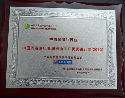 本次评选以“创新、品牌、实力、责任”为主旨,经过行业公众网上投票、专业市场调研以及总评榜组委会专家的严格评审,广西南宁玉柴润滑油有限公司在众多申报参评的企业中脱颖而出,获得“(2013)中国润滑油行业润滑油工厂优秀设计奖”殊荣。
